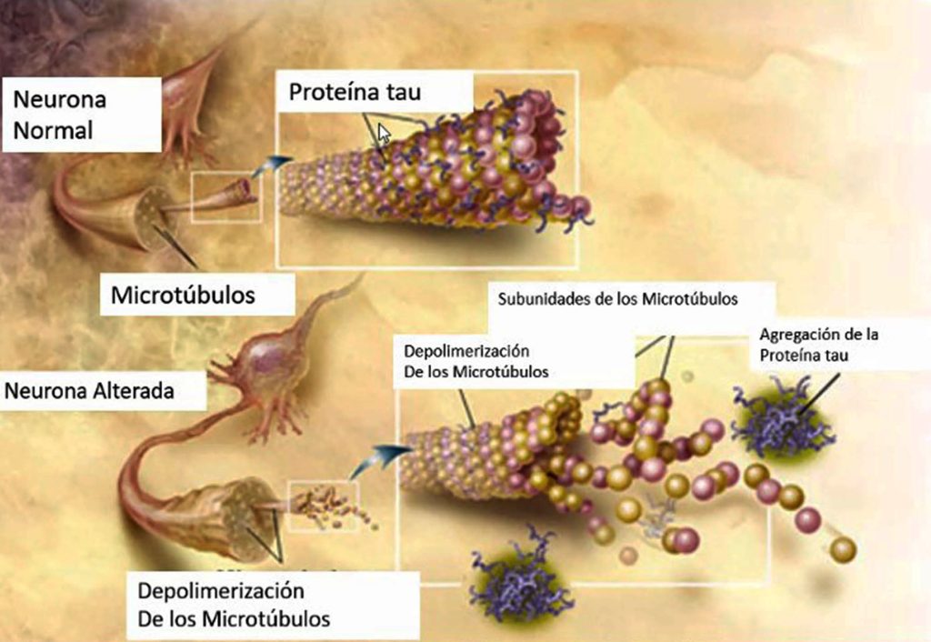 “Estas dos lesiones son proteínas que sufren un cambio bioquímico que permite que se empiecen a autoagregar entre sí. En el caso de los ovillos neurofibrilares son como marañas de una proteína que se llama tau, la cual, en condiciones normales, cumple una función muy importante que forma parte de los microtúbulos del citoesqueleto de la neurona y transporta materiales a todo lo largo de las neuronas. En el Alzheimer tau se empieza a despegar de los microtúbulos y sufre un cambio bioquímico que consiste en un aumento en la fosforilización de la proteína y a veces su acetilación, y entonces se empieza a pegar entre ella formando filamentos de proteína que se acumulan en la neurona, la aíslan y la inactivan” abunda.