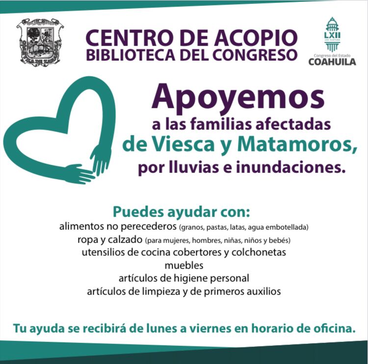El Congreso del Estado de Coahuila convoca a toda la comunidad a que participe con la donación de víveres e insumos de primera necesidad, para apoyar a las familias afectadas por las recientes lluvias en los municipios de Viesca y Matamoros, para tal efecto se habilitó la Biblioteca del Congreso (Blvd. Francisco Coss s/n, esquina con Acuña, Zona Centro, Saltillo, Coahuila, C.P.25000) como centro de acopio de lunes a viernes, en horario de oficina, donde se estarán recibiendo alimentos no perecederos (granos, pastas, latas, agua embotellada), ropa y calzado (para mujeres, hombres, niñas, niños y bebés), utensilios de cocina, cobertores y colchonetas, muebles, artículos de higiene personal, productos de limpieza y material de primeros auxilios.
