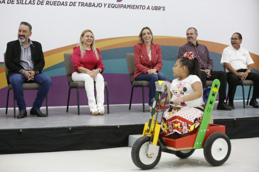 Junto a Manolo Jiménez, Secretario de Inclusión y Desarrollo Social del Estado, y la senadora Verónica Martínez García, la Presidenta Honoraria del DIF Estatal entregó 54 de las 260 sillas de ruedas de trabajo que se distribuirán en todas las regiones de la entidad gracias a las gestiones hechas con la Fundación Internacional Oasis.
