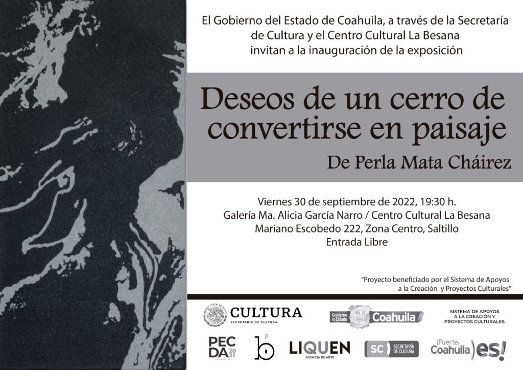 La Secretaría de Cultura de Coahuila (SC), a través del Museo de Artes Gráficas, invita a la exposición “Deseos de un cerro de convertirse en paisaje”, de Perla Mata, que se llevará a cabo este 30 de septiembre en el Centro Cultural La Besana a las 19:30 horas, en la Galería María Alicia García Narro y es apta para todo público con entrada gratuita.