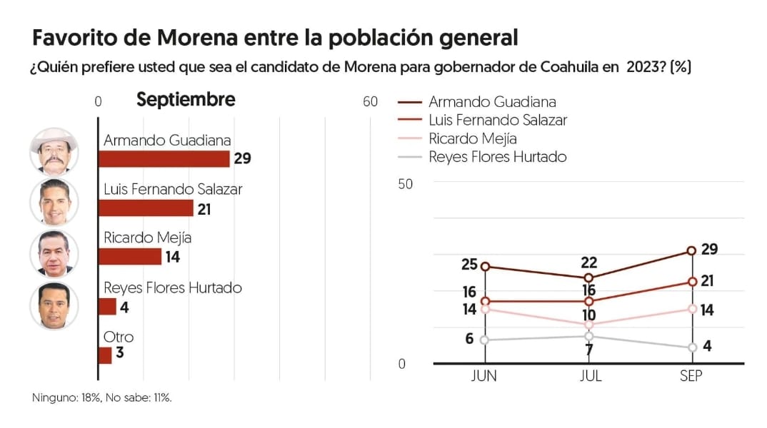 Además, según el análisis de El Financiero, Guadiana Tijerina ha subido su porcentaje de preferencia entre la población general en el último trimestre, pues en junio contaba con 25 por ciento, en julio con 22 y en septiembre subió a 29 por ciento.
