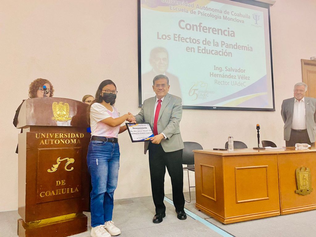 Monclova, Coahuila.- El rector de la Universidad Autónoma de Coahuila, Salvador Hernández Vélez impartió en la Escuela de Psicología Monclova, la conferencia “Efectos Post-Pandemia en la Educación», con la presencia del coordinador de Unidad Norte, Luis Carlos Talamantes Arredondo, la directora del plantel, Susana V. Sierra Herrera, alumnos y docentes.
