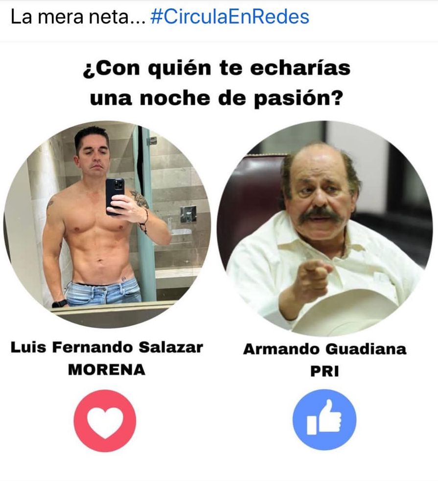 Pero lo cierto es que la imagen es más que elocuente. La titulan “¿con quien te echarías una noche de pasión?”, y en la misma aparece, del lado derecho, una fotografía de Guadiana mostrando a un hombre de avanzada edad, calvo, lleno de arrugas y con un evidente sobrepeso; en tanto que del lado izquierdo se incluye la foto de Salazar, joven, desnudo de la cintura hacia arriba y luciendo un cuerpo musculoso.