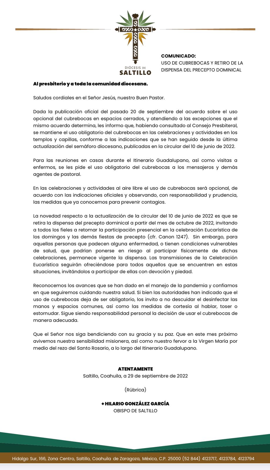 Por medio de una circular, este jueves el obispo de la Diócesis de Saltillo, Hilario González García, informó que el uso del cubrebocas como medida preventiva contra la Covid-19 seguirá siendo obligatorio en los templos y capillas que integran esta organización religiosa.