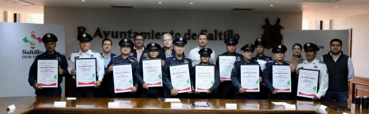 En la reunión de coordinación, el alcalde de Saltillo, José María Fraustro Siller, entregó reconocimientos y estímulos económicos a 11 policías municipales por 25 años de trayectoria en la corporación.