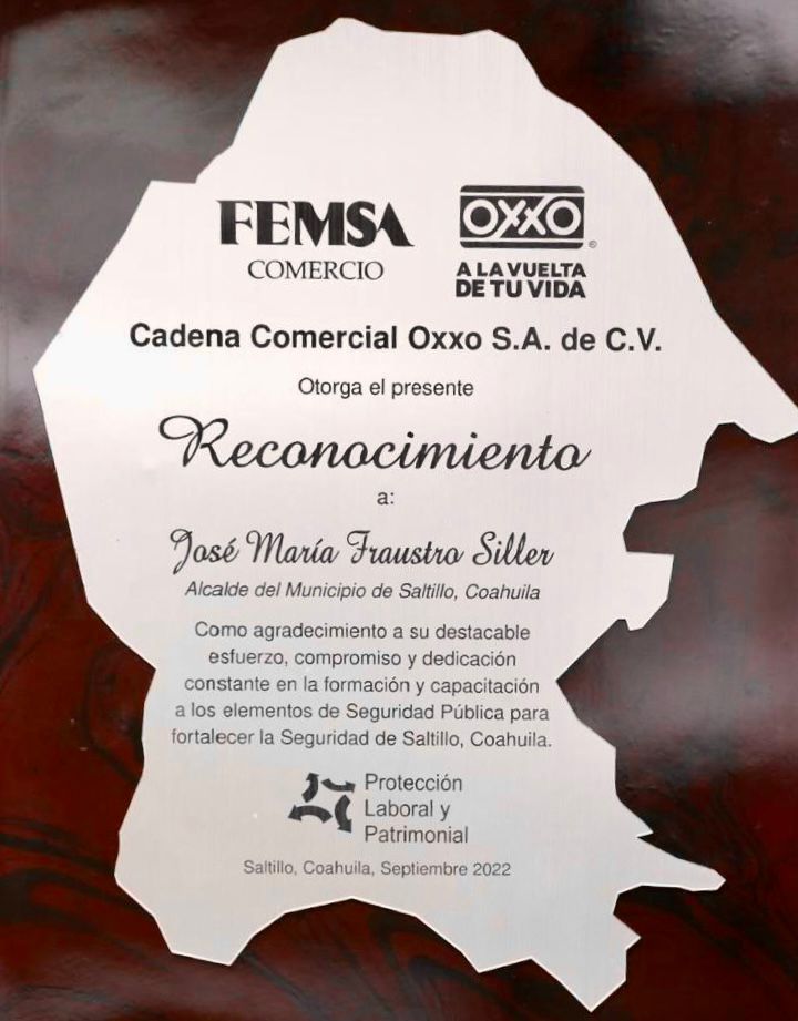 El Gobierno Municipal de Saltillo, que encabeza el alcalde José María Fraustro Siller, recibió un reconocimiento por parte de la empresa Femsa por la seguridad que prevalece en la ciudad y que beneficia a la cadena de tiendas Oxxo.