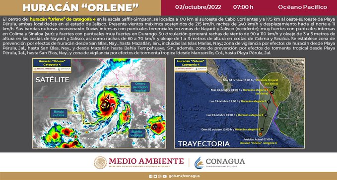 Ciudad de México.- El centro del huracán «Orlene» de categoría 4 en la escala Saffir-Simpson, se localiza a 170 km al suroeste de Cabo Corrientes y a 175 km al oeste-suroeste de Playa Pérula, en Jalisco, informó el Servicio Meteorológico Nacional (SMN).