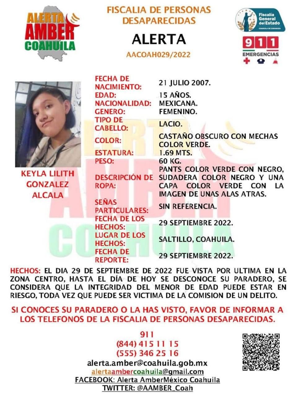 La Fiscalía de Personas Desaparecidas del Estado de Coahuila dio a conocer que este domingo se tuvo contacto con la menor Keyla Lilith González Alcalá, de 15 años, reportada como desaparecida el pasado 29 de septiembre.