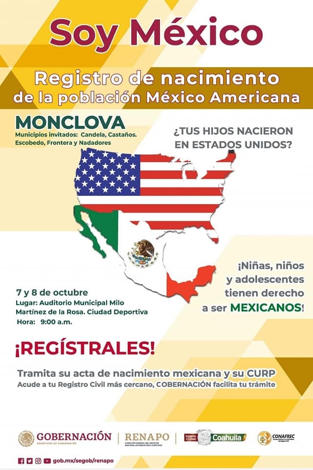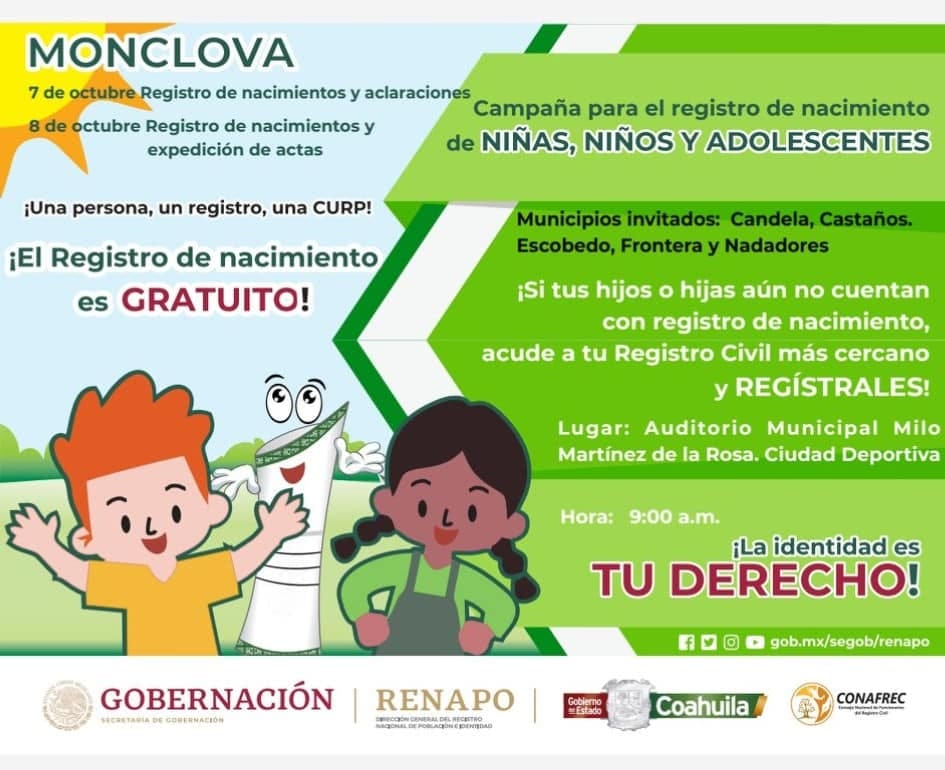 Monclova, Coahuila.- Dentro de la Campaña de Registro de Nacimiento de Niñas, Niños y Adolescente y el objetivo de garantizar el Derecho a la Identidad de las niñas y niños de Coahuila, el Gobierno del Estado (a través del Registro Civil y en coordinación con los gobiernos municipales) llevará a cabo una brigada de registro de nacimientos y aclaraciones.