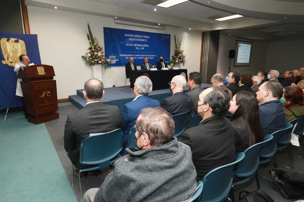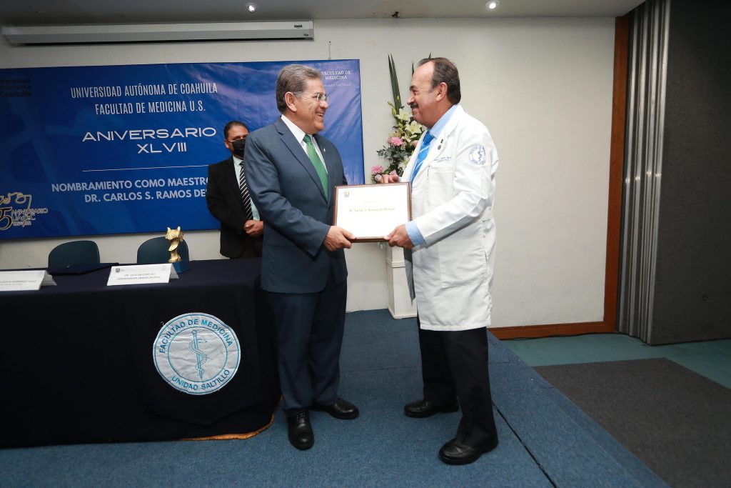 En el marco del 48 aniversario de la Facultad de Medicina Saltillo, de la Universidad Autónoma de Coahuila, en Sesión Solemne Extraordinaria de Consejo Directivo se entregó el nombramiento como Maestro Decano al Dr. Carlos S. Ramos del Bosque, por su destacada trayectoria en el campo de la medicina y la docencia.