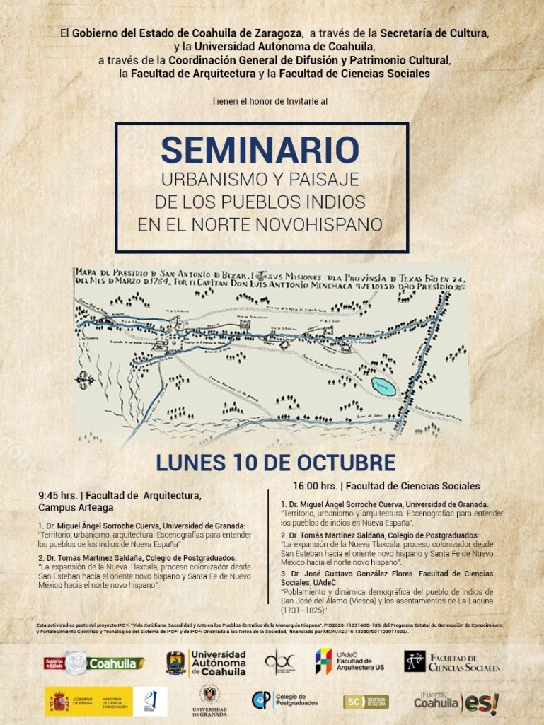 La Universidad Autónoma de Coahuila a través de la Secretaria de Cultura del Estado, la Coordinación General de Difusión y Patrimonio Cultural, la Facultad de Arquitectura y la Facultad de Ciencias Sociales invitan al Seminario “Urbanismo y Paisaje de los Pueblos Indios en el Norte Novohispano”.