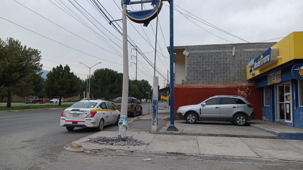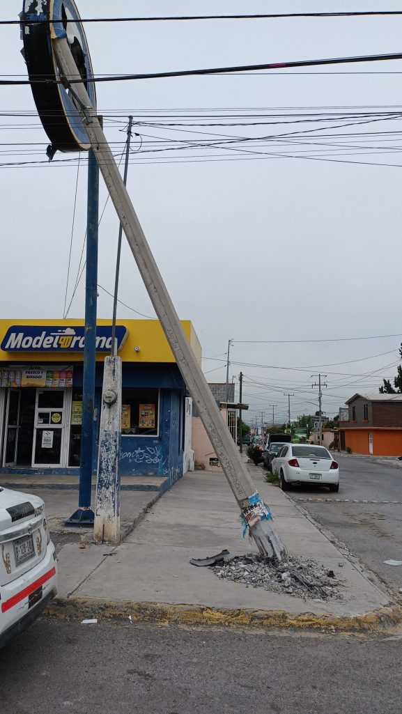 Luego de ser impactado por un vehículo de grandes dimensiones, un poste de concreto de la Comisión Federal de Electricidad ubicado en la esquina del bulevar Urdiñola y Calle 38 en el fraccionamiento Colinas del Sur se encuentra a punto de colapsar, arriesgando la vida de los peatones y los vehículos que transitan por ese punto de la ciudad.