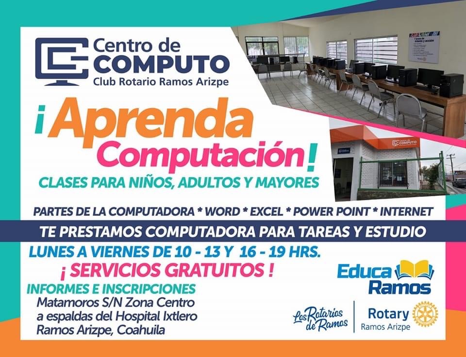 Luego de la reapertura del albergue campesino “Aurelia Rodríguez de Sandoval” en Ramos Arizpe, el cual está a cargo del Club Rotario de esta ciudad, se ha habilitado un nuevo centro de cómputo para personas de escasos recursos que requieran realizar consultas, elaborar trabajos y la expedición de impresiones fotostáticas, informó Mario Aguirre Rangel, integrante de la agrupación altruista.