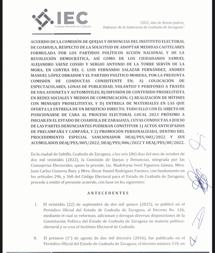 “Se presentaron dos quejas, una en el Instituto Electoral de Coahuila la otra en el INE, una contra Luis Fernando Salazar y otra contra Ricardo Mejía Berdeja, los dos aspirantes a ser candidatos por ese partido para la gubernatura de Coahuila”, platicó.