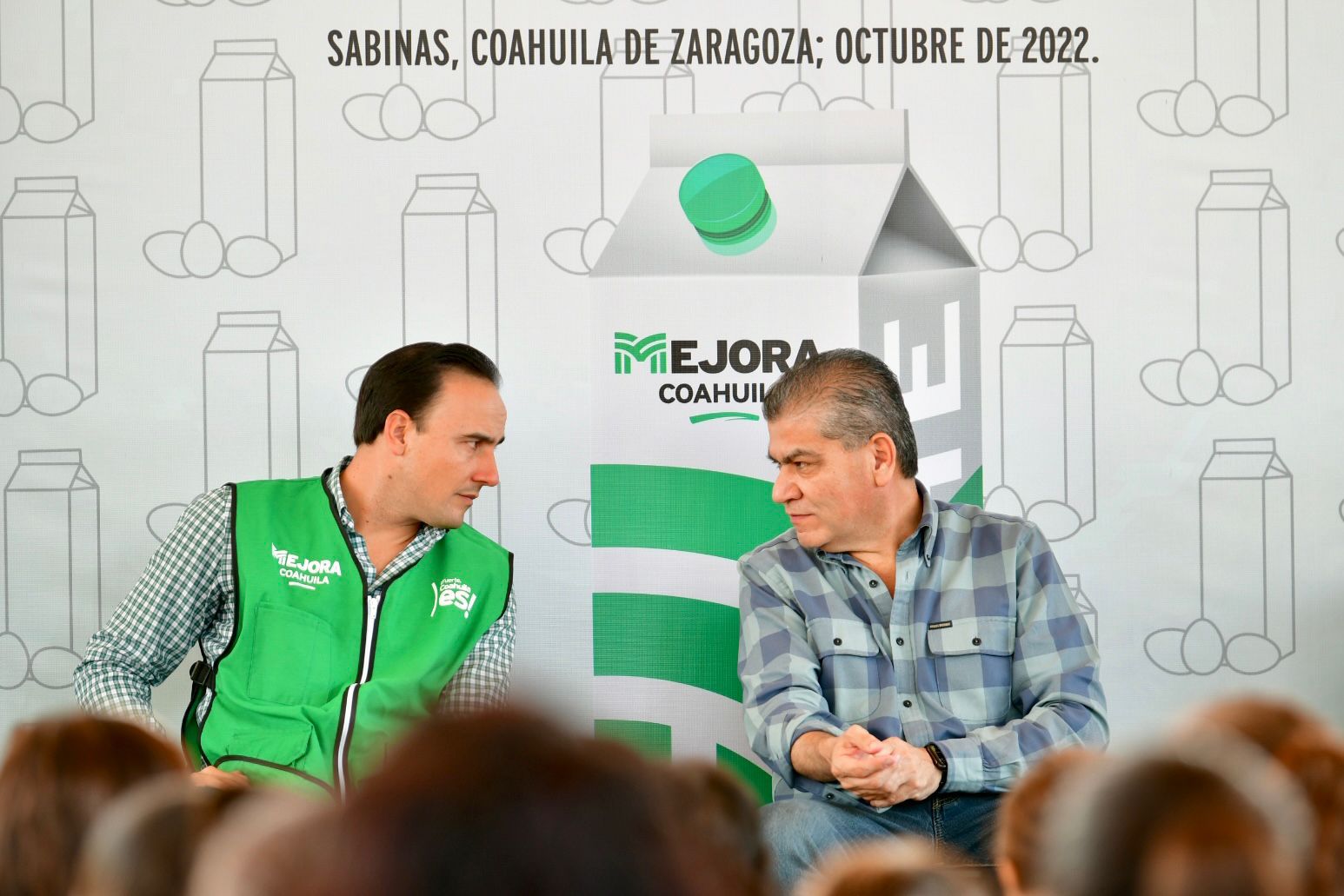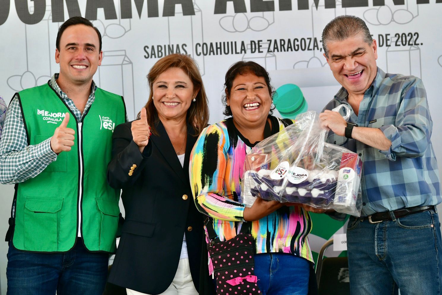 En Sabinas, Riquelme Solís, acompañado de la alcaldesa Diana Haro Martínez y del secretario Manolo Jiménez Salinas, titular de la SIDS, entregaron leche y huevos, productos de la canasta básica, que son primordiales en la alimentación de las familias cohuilenses.