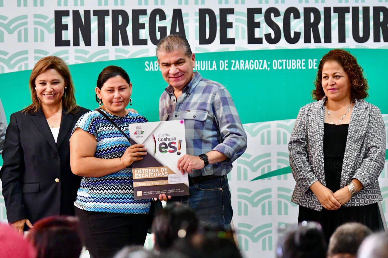 En las instalaciones del Gimnasio Municipal de Sabinas, el gobernador Miguel Riquelme, la alcaldesa Diana Haro Martínez y el titular de la Secretaria de Vivienda y Ordenamiento Territorial del Estado, Enrique Martínez y Morales, entregaron escrituras a 144 familias y se anunció que hay más de 350 trámites en proceso de legalización.