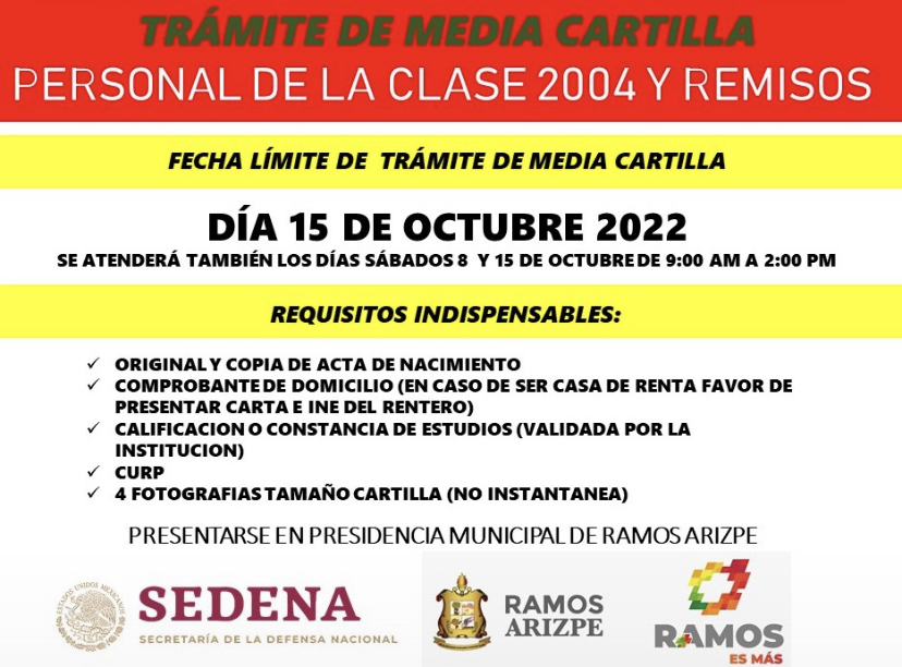 La junta local de reclutamiento en coordinación con el municipio de Ramos Arizpe, invitan a la clase 2004 y remisos a iniciar el trámite de la media cartilla militar en las instalaciones de la Dirección de Educación en la Presidencia Municipal. Tomás Gutiérrez Merino, titular de la Secretaría de Desarrollo Social recalcó que la atención a las personas interesadas será hasta el sábado 15 de octubre.