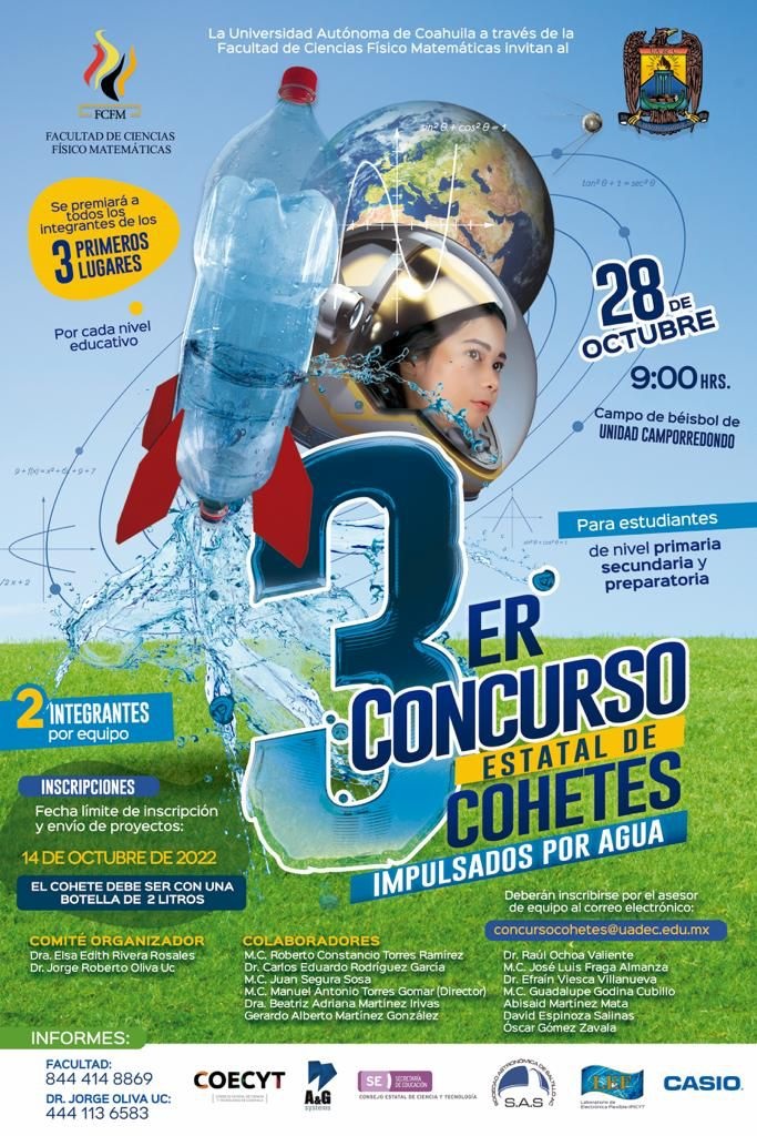 La Universidad Autónoma de Coahuila a través de la Facultad de Ciencias Físico Matemáticas invitan a participar en el Tercer Concurso Estatal de Cohetes Propulsados por Agua; la fecha de registro de aspirantes vence este viernes 14 de octubre.