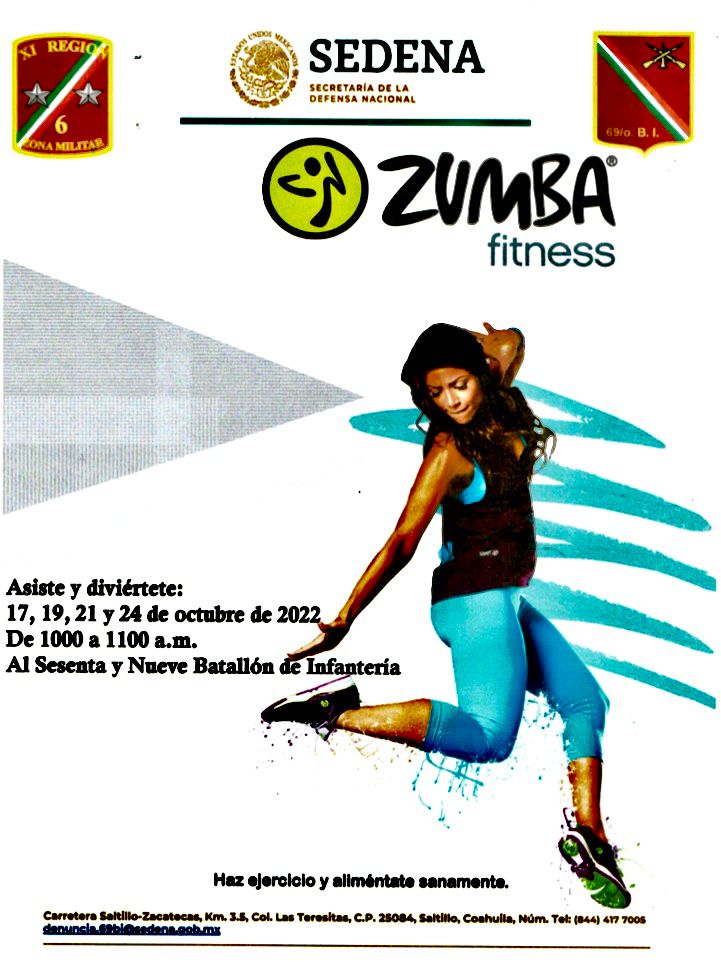 Los próximos 17, 19, 21 y 24 de octubre de este 2022, se ofrecerán clases gratuitas de zumba en las instalaciones del 69 Batallón de Infantería de la Secretaría de la Defensa Nacional (Sedena) para el público en general.