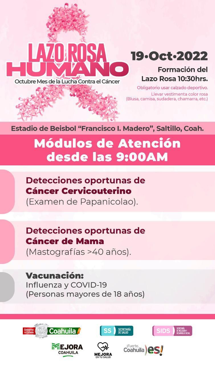 En el marco del Mes de la Lucha Contra el Cáncer de Mama, el Gobierno del Estado, a través de la Secretaría de Salud de Coahuila y en conjunto con la Secretaría de Inclusión y Desarrollo Social, formará este miércoles 19 de octubre a las 10:30 horas, el “Lazo Rosa Humano” en el estadio de béisbol Francisco I. Madero.