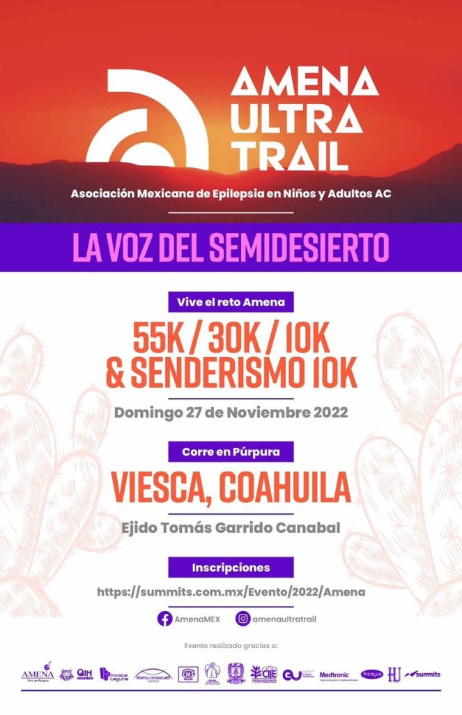 La Universidad Autónoma de Coahuila a través de la Coordinación General de Extensión Universitaria y el Hospital Universitario de Saltillo, en coordinación con la Asociación Mexicana de Epilepsia en Niños y Adultos A.C. Vivir en Púrpura (AMENA), invitan al público en general a participar en la Carrera “Amena Ultra Trail”, que se llevará a cabo el 27 de noviembre de 2022 en el ejido Tomás Garrido Canabal del municipio de Viesca, Coahuila.