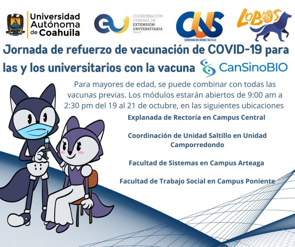 Del 19 al 21 de octubre de este 2022, se llevará a cabo una jornada de aplicación de refuerzos de la vacuna contra la Covid-19 de la farmacéutica CanSino para estudiantes mayores de edad pertenecientes a la Universidad Autónoma de Coahuila (UA de C) en Saltillo y Arteaga.