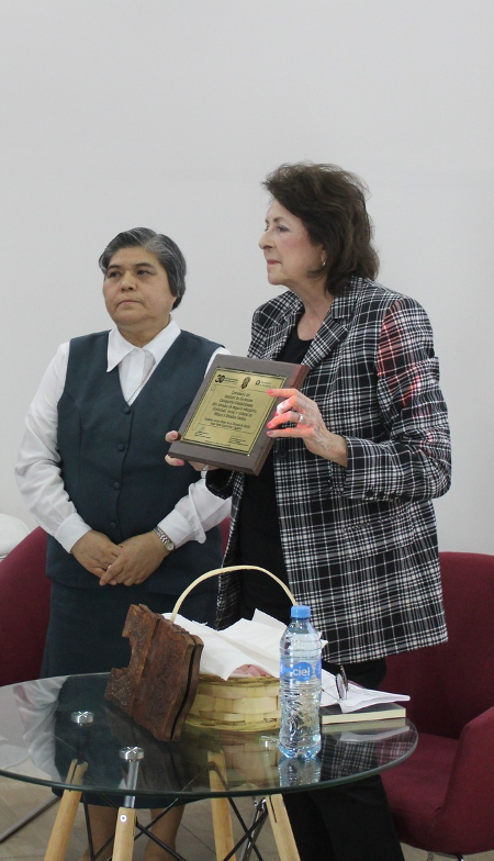 Ante un auditorio en forma de ágora repleto de interesados por el sentido de este merecido homenaje, la Hermana Superiora Guillermina Rosales Acevedo y la Hermana María Graciela Sandoval Rodríguez entablaron un interesante diálogo con la Dra. Donna Kabalen, Profesora Investigadora del Departamento de Estudios Humanísticos. Responsable del proyecto de CONACYT “La mujer en la cultura transnacional de la frontera norte México-Estados Unidos: las prácticas de lo escrito, 1850-1950” y miembro del Sistema Nacional de Investigadores.