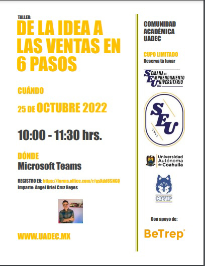 Continúan las actividades el martes 25 de octubre, a las 10:00 horas, con el taller on line “De la idea a las ventas en seis pasos”, enfocado en el desarrollo de modelos de negocios innovadores con base en análisis de problemas, investigación de mercados e implementación tecnológica, a cargo del Dr. Ángel Uriel Cruz Reyes, fundador de la plataforma BETREP.