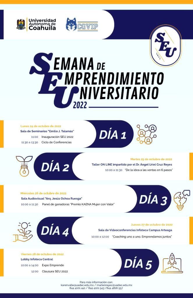 Con el objetivo de brindar herramientas a los universitarios en el tema del emprendimiento, la Universidad Autónoma de Coahuila a través de la Coordinación General de Vinculación e Innovación Productiva invita a la comunidad universitaria a la Primera Semana de Emprendimiento Universitario (SEU) 2022, del 24 al 28 de octubre de 2022.