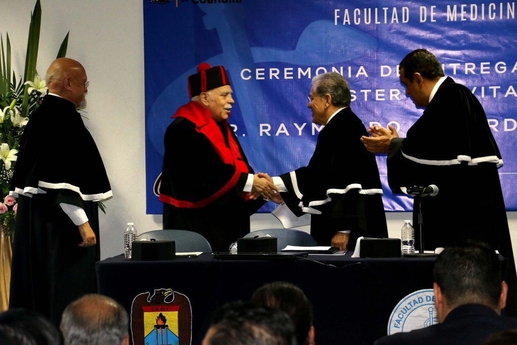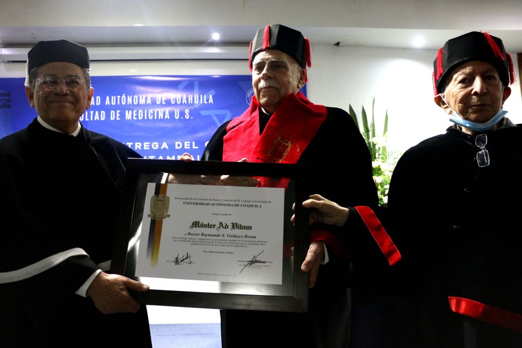 S En ceremonia solemne, la Universidad Autónoma de Coahuila a través de la Facultad de Medicina de la Unidad Saltillo, otorgó el grado de Maestro Ad Vitam al Dr. Raymundo Verduzco Rosán en reconocimiento a su destacada trayectoria de más de 45 años y su incansable labor profesional al servicio de la salud de los coahuilenses.