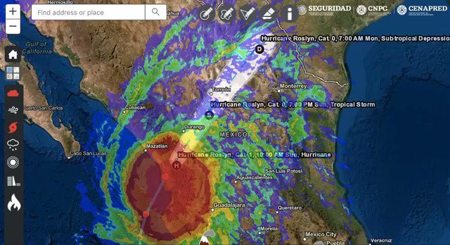De acuerdo con el último reporte, a las 08:00 horas el huracán «Roslyn» se localizaba a 90 km al suroeste de Tepic, con vientos máximos sostenidos de 195 km/h y se desplaza al nor-noreste a 26 km/h.