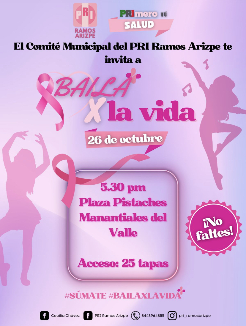 El Comité Directivo Municipal del Partido Revolucionario Institucional (PRI) en Ramos Arizpe está invitando a toda la población de este municipio a participar en la actividad denominada “Bailar x la Vida”, esto en el marco de la conmemoración del mes del cáncer de mama.