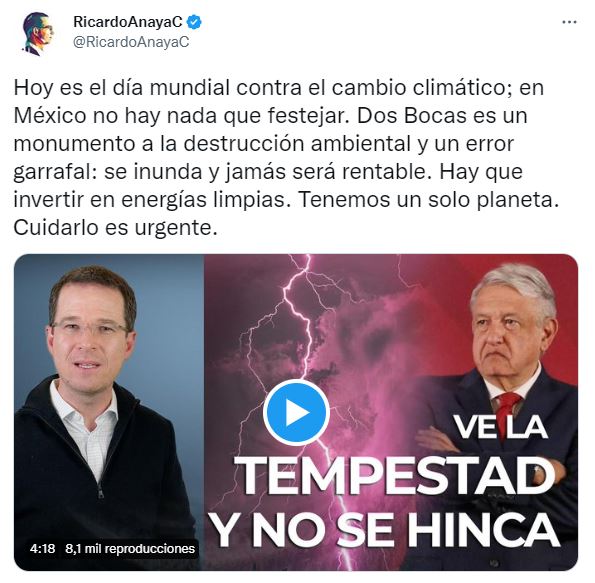 Ricardo Anaya señaló que: “La refinería de Dos Bocas es, además de económicamente absurda, un monumento a la destrucción ambiental. A este gobierno se le explicó hasta el cansancio que ese era un pésimo lugar para hacer una refinería. Entre otras cosas porque implicaba destruir muchísimas hectáreas de manglar, donde viven miles especies animales, y que son una barrera natural para proteger las costas”.