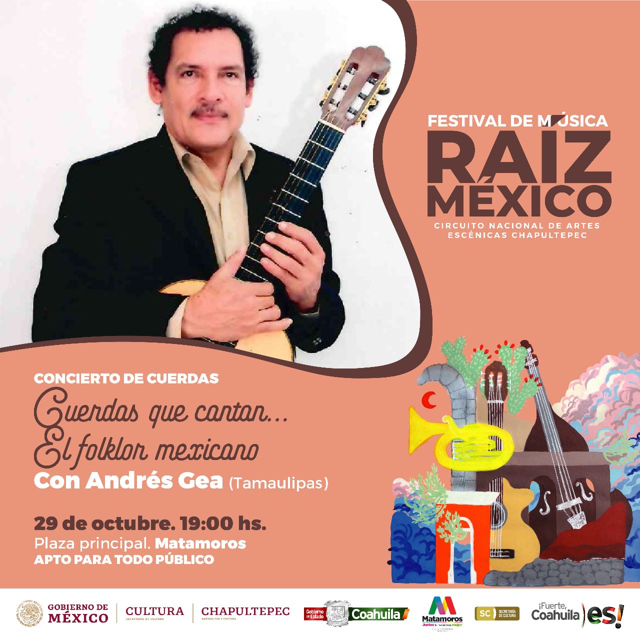 + Presentación “Cuerdas que cantan… El folklor mexicano”, Andrés Gea Cruz/ Tamaulipas, plaza principal, Matamoros, 20:00 horas.