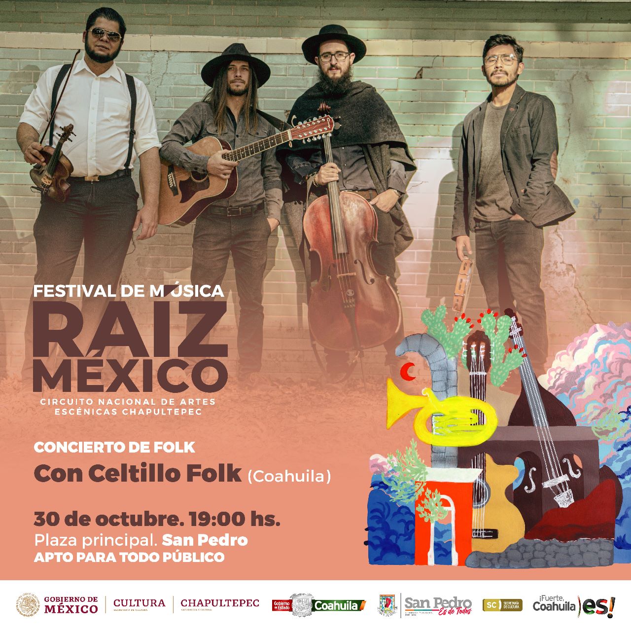 Concierto “Celtillo Folk”, Héctor Manuel Rico Benítez / Coahuila, plaza principal, San Pedro, 19:00 horas.