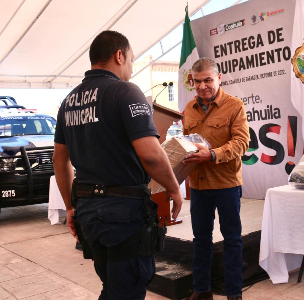 Sabinas, Coah.- “Coahuila tiene fortaleza institucional que no es un mérito de Gobierno, sino de la sociedad en conjunto”, aseveró el gobernador Miguel Ángel Riquelme Solís al entregar dos patrullas y dos vehículos al Mando Único de Seguridad Pública Municipal.