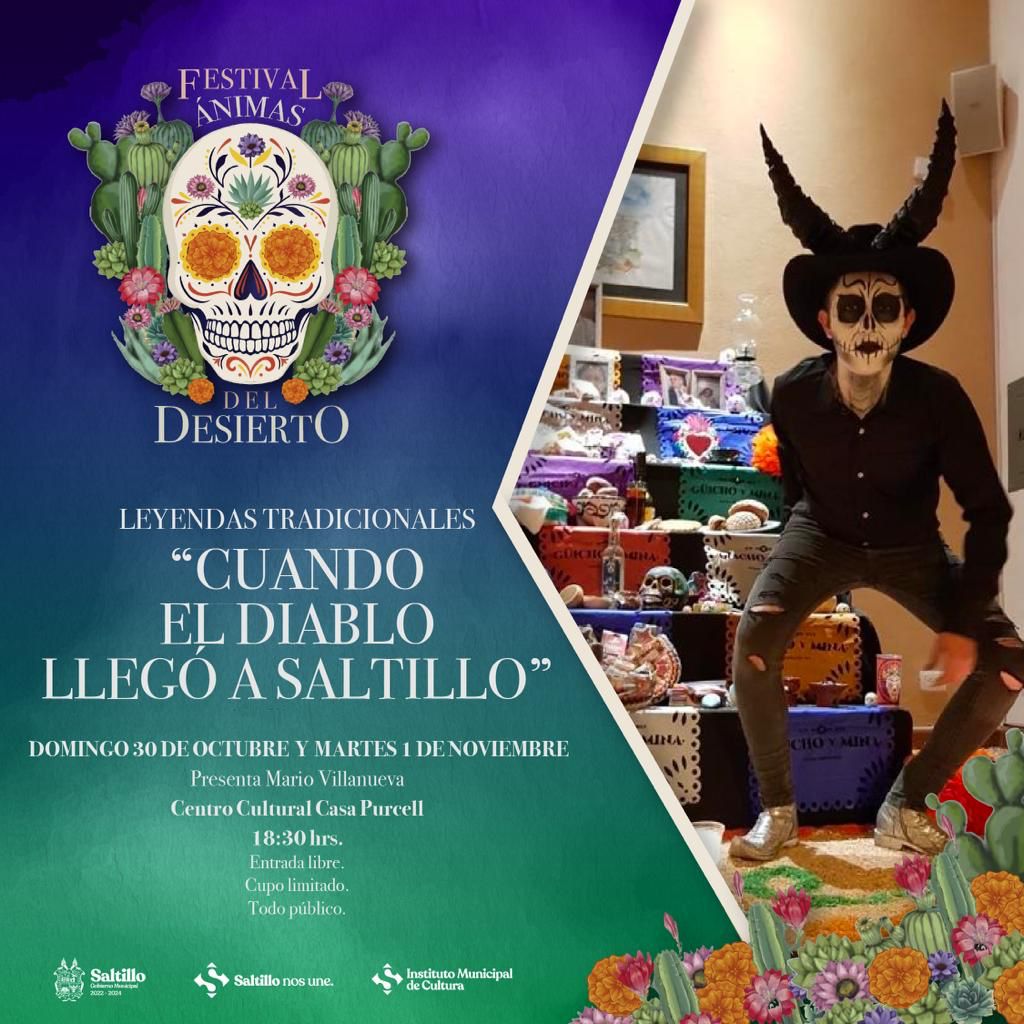 Dentro del Festival Ánimas del Desierto, organizado por el Instituto Municipal de Cultura de Saltillo (IMCS) para celebrar el Día de Muertos, el cuentacuentos Mario Villanueva ofrecerá un espectáculo de leyendas saltillenses denominado «Cuando el Diablo Llegó a Saltillo», en el que narrará algunos relatos de la tradición oral que han pasado de generación en generación dentro de la capital coahuilense.