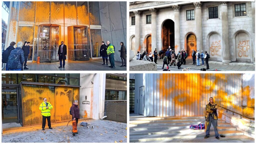“Los edificios fueron elegidos por representar los pilares que apoyan y mantienen el poder de la economía de los combustibles fósiles: el gobierno, las fuerzas de seguridad, las finanzas y los medios de comunicación”, afirma el comunicado de Just Stop Oil.