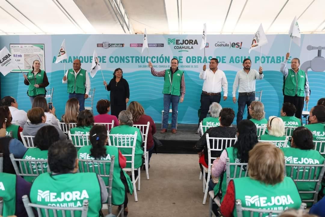 San Juan de Sabinas.- En gira de trabajo por la región carbonífera, el secretario de Inclusión y Desarrollo Social, Manolo Jiménez Salinas, y el alcalde de San Juan de Sabinas, Mario López Gámez, en el marco del programa “Mejorando Ando” dieron arranque a la construcción de Obras de Agua Potable en la colonia Prolongación Progreso, en donde se beneficiará de manera directa a más de 8 mil habitantes.