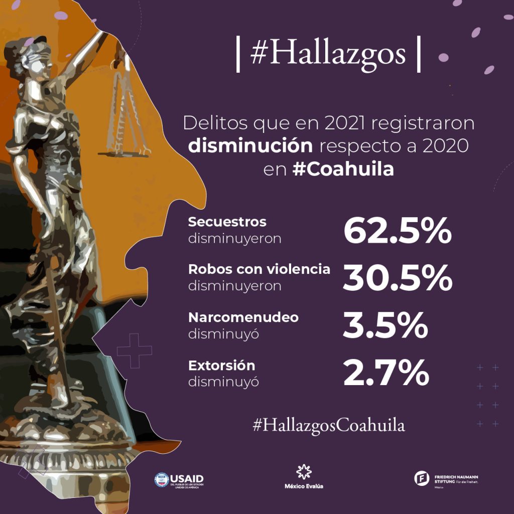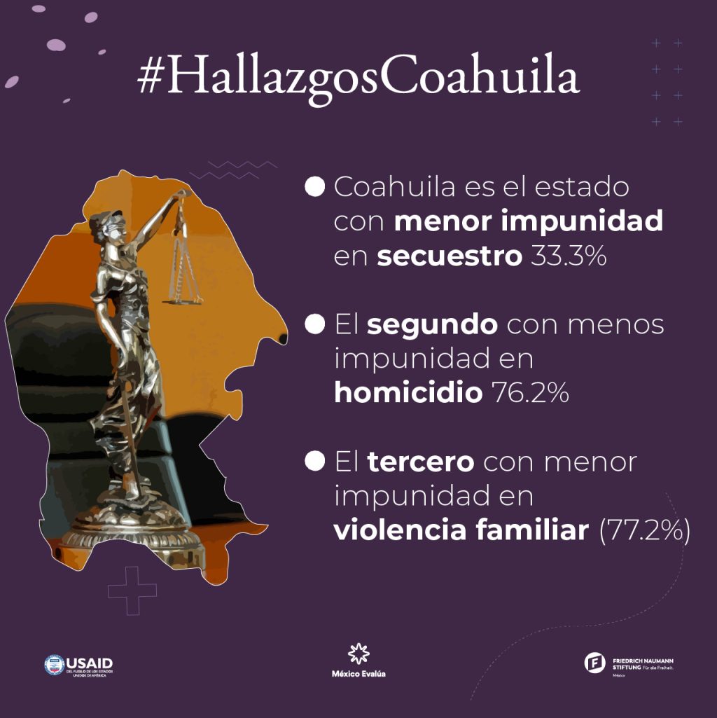 Datos del reporte Hallazgos desde lo local 2021: Coahuila, elaborado por México Evalúa, muestran que Coahuila es la novena entidad con menor impunidad en el país y la tercera con mayor avance en las condiciones necesarias para la adecuada operación del sistema de justicia penal. Al analizar la impunidad por delito, el análisis muestra que Coahuila es el estado con menor impunidad en secuestro (33.3%), el segundo con menor impunidad en homicidio (76.2%) y el tercero con menor impunidad en violencia familiar (77.2%).
