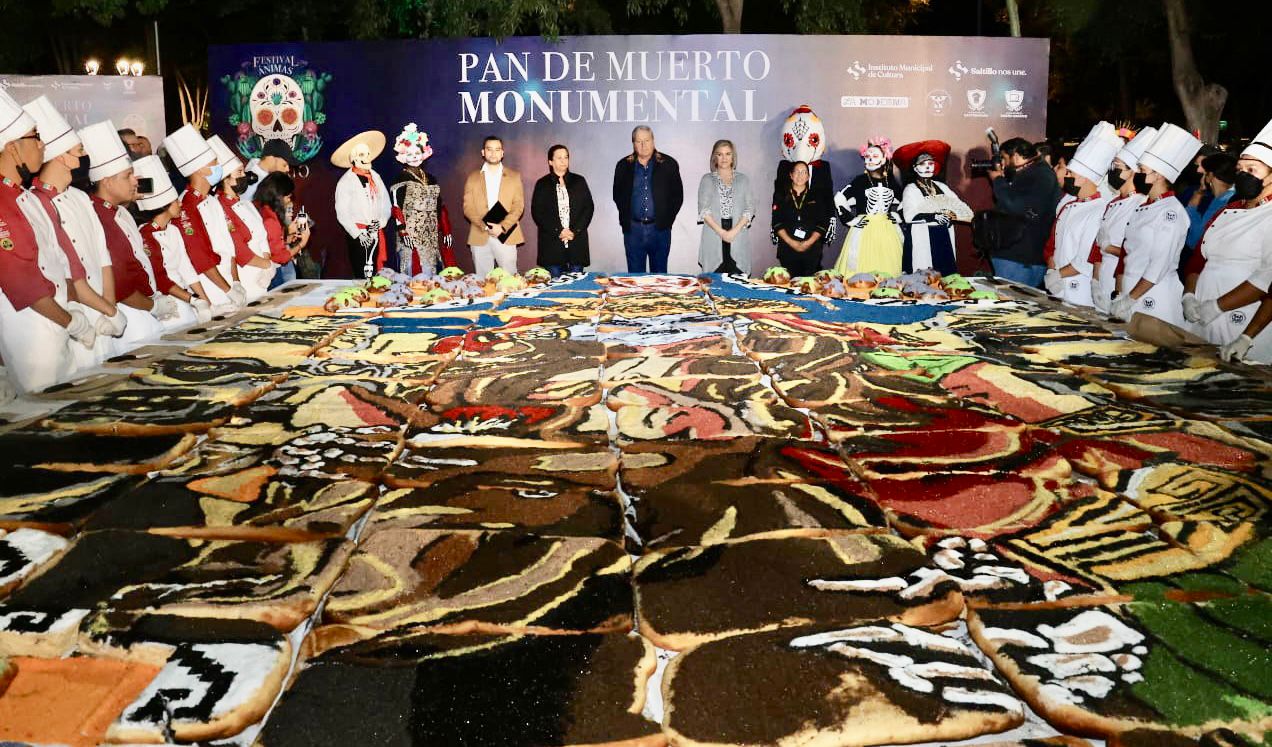 El Gobierno Municipal de Saltillo cerró este miércoles 2 de noviembre su Festival Ánimas del Desierto 2022 con la presentación del Pan de Muerto Monumental en la Alameda Zaragoza, en coordinación con la Universidad Vizcaya de las Américas.