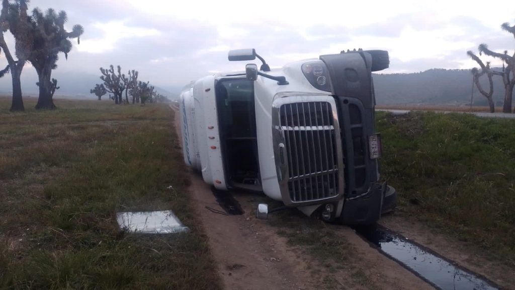 El conductor de un tractocamión volcó su unidad en la carretera federal 57, en el kilómetro 210, a la altura de la estación gasolinera del ejido Huachichil, por lo que elementos de la Policía de Arteaga realizaron labores de abanderamiento y liberación del chofer que quedó al interior de la unidad.