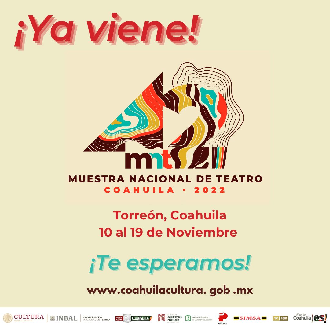 Torreón.- En el marco de la Muestra Nacional de Teatro 2022 (MNT), que se llevará a cabo del 10 al 19 de noviembre en Torreón, el Estado de Coahuila contará con la representación de 4 compañías y grupos teatrales que compartirán con el resto de México la variedad y calidad de propuestas escénicas que el estado tiene para ofrecer.