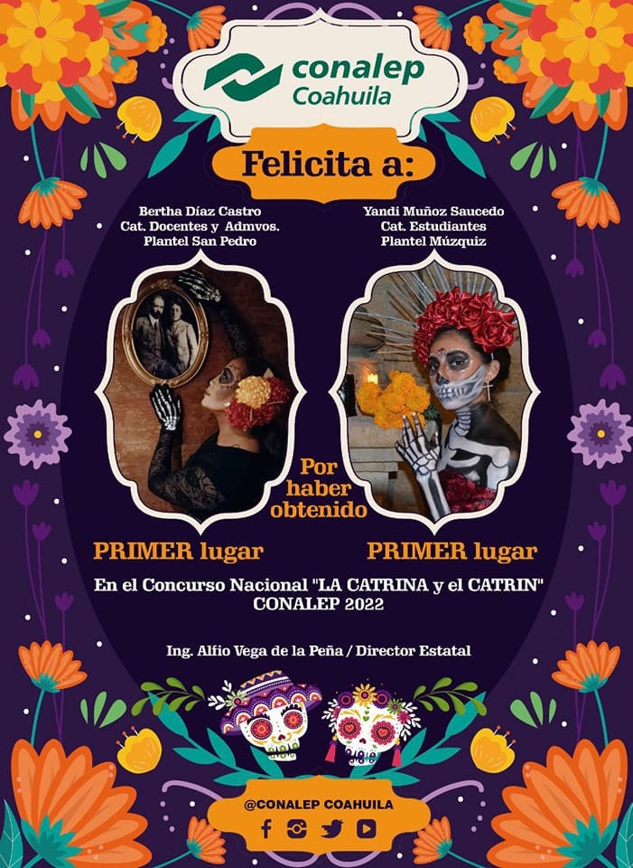 El gobernador Miguel Ángel Riquelme Solís; el Secretario de Educación del Estado, Francisco Saracho Navarro, y el Director Estatal de CONALEP, Alfio Vega de la Peña, externaron su agrado y felicitaron a la alumna Yandi Yaravi (del plantel Múzquiz) y a la docente Bertha Díaz (de San Pedro de las Colonias), quienes entre más de Mil 500 participantes obtuvieron el 1er Lugar en el concurso Nacional de «La catrina y el catrín 2022», organizado por CONALEP Nacional.