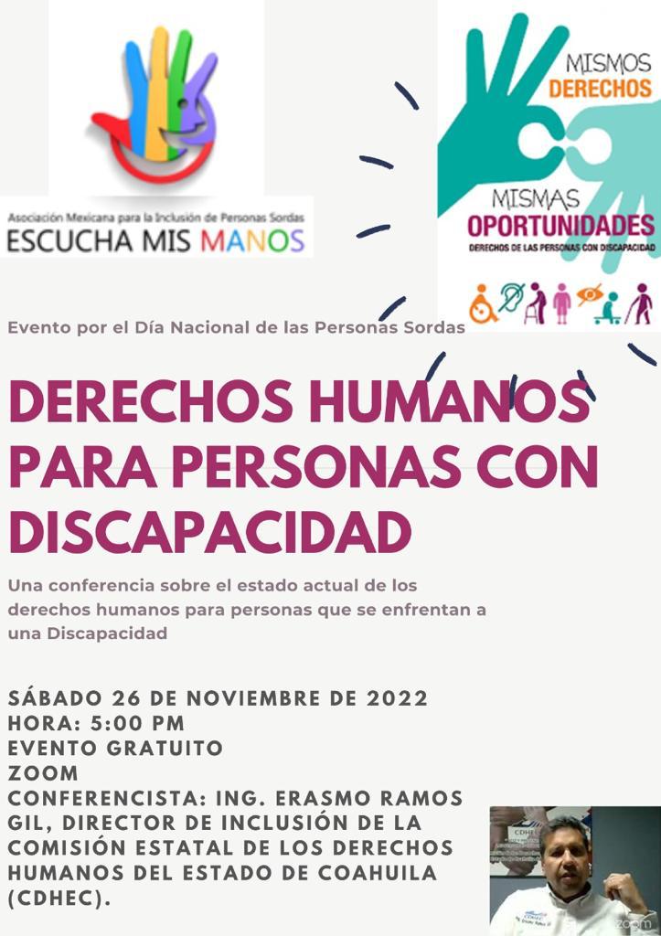 En conjunto, la Asociación Civil «Escucha Mis Manos» y la Comisión de los Derechos Humanos del Estado de Coahuila (CDHEC) ofrecerán vía Zoom la conferencia gratuita «Derechos Humanos para Personas con Discapacidad», el próximo 26 de noviembre, a las 5:00 de la tarde.