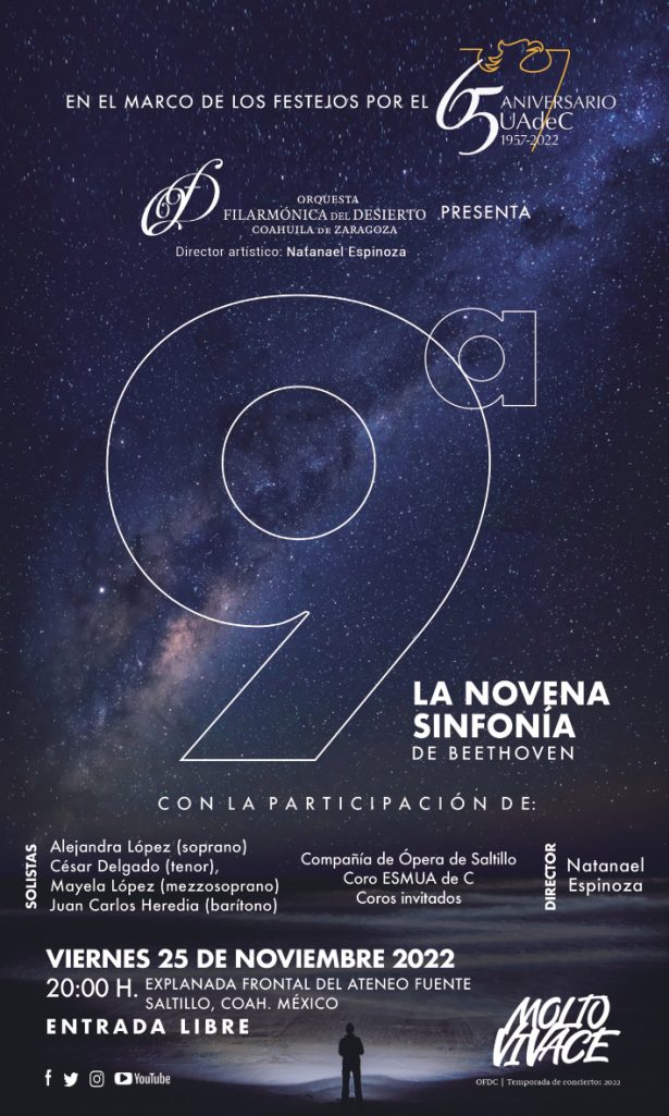 Señalaron que el evento se llevará a cabo el 25 de noviembre de 2022 a las 20:00 horas en la explanada frontal de la Escuela de Bachilleres Ateneo Fuente y la entrada será libre, donde la Filarmónica del Desierto presentará la obra magna de la música occidental, en un montaje para 200 artistas en escena entre instrumentistas y coro.