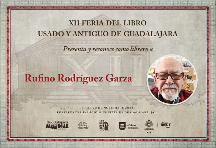 El próximo sábado, en una ceremonia que se llevará a cabo en los Portales del Palacio Municipal de Guadalajara, Jalisco, Rufino Rodríguez Garza recibirá un reconocimiento por parte de la Feria del Libro Usado y Antiguo de Guadalajara, en el marco de su doceava edición.