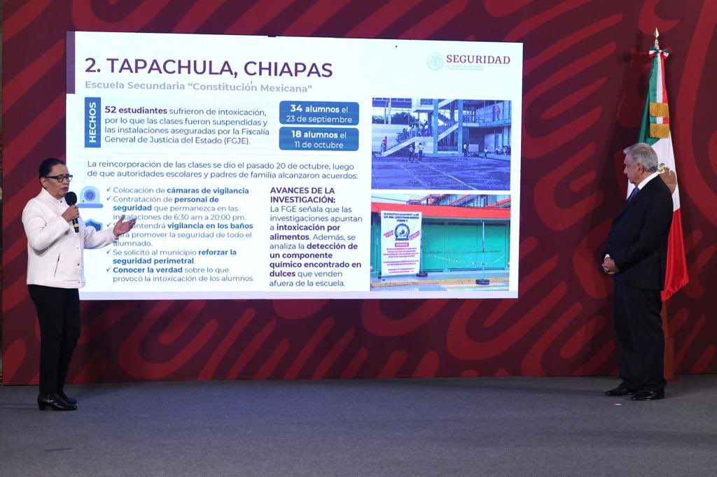 Ciudad de México.- Rosa Icela Rodríguez Velázquez, secretaria de Seguridad y Protección Ciudadana (SSPC) informó que, de acuerdo a estudios toxicológicos en los casos de presuntos casos de intoxicación de alumnos de secundarias y preparatorias de Chiapas, Veracruz e Hidalgo, arrojaron resultados negativos a sustancias ilegales como metanfetaminas, marihuana, cocaína u otras sustancias ilegales.