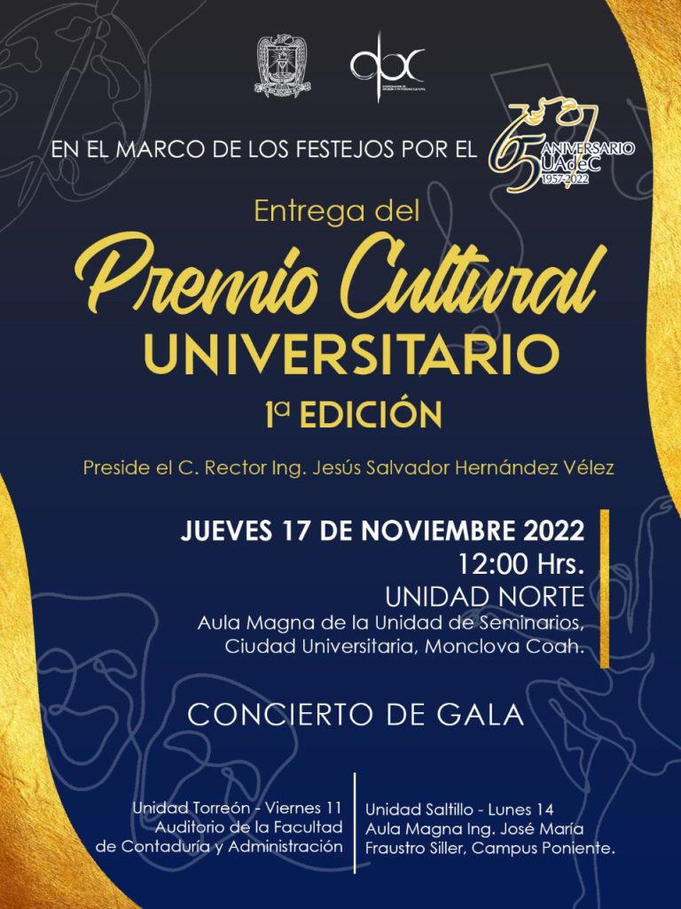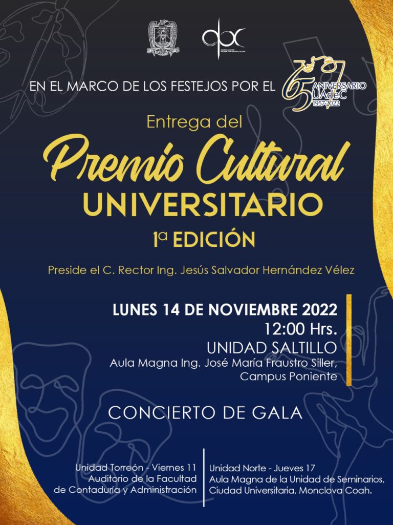 Como parte de los festejos por el 65 aniversario de la Universidad Autónoma de Coahuila, la Coordinación General de Difusión y Patrimonio Cultural, llevará a cabo la entrega de reconocimientos a los ganadores del Primer Premio Cultural Universitario en la Unidad Saltillo, Torreón y Norte.