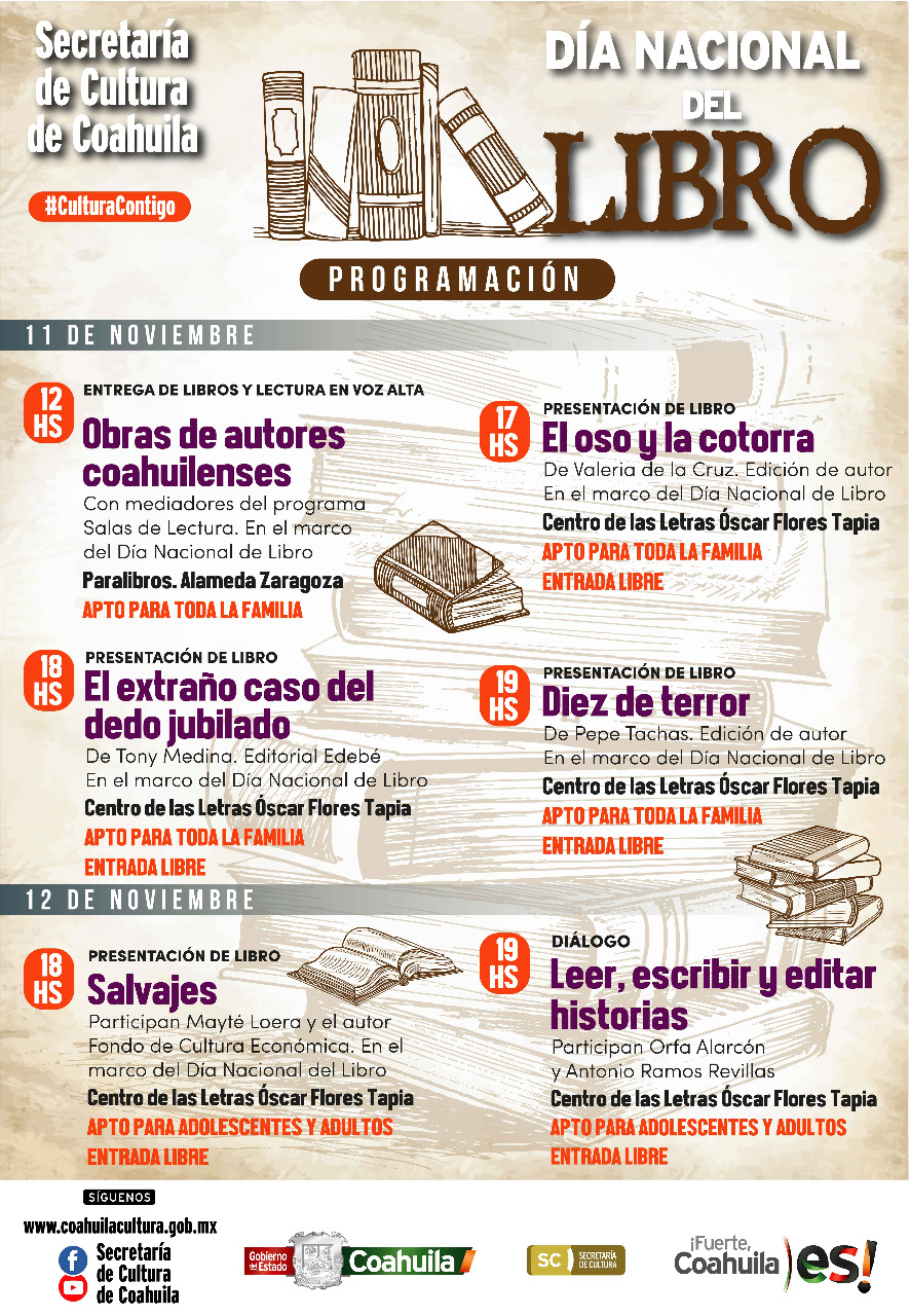 La Secretaría de Cultura de Coahuila (SC), a través de la Dirección de Cultura Escrita y en el marco del Plan Estatal de Fomento a la Lectura, llevará a cabo diversas actividades para conmemorar el Día Nacional del Libro este 12 de noviembre, en las distintas regiones del estado.